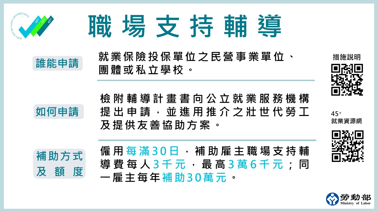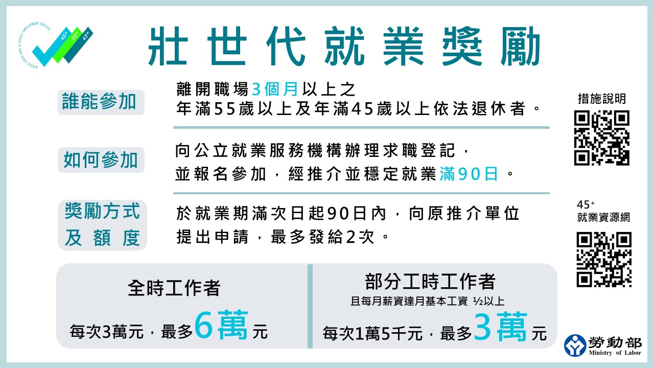 勞動部說明,「55Plus壯世代就業促進措施」以年滿55歲以上及45歲以上依法退休者為適用對象,運用就業獎勵鼓勵重返職場,凡離開職場3個月以上經公立就業服務機構推介就業,受僱滿90日發給獎勵3萬元,最多發給兩次,部分工時工作者也提供每次1萬5千元之獎勵,並鼓勵雇主為公立就業服務機構推介之壯世代勞工協助適應職場環境,如提供專屬教育訓練機制、彈性調整工作時間、家庭照顧協助或補助、心理諮詢與關懷等各項友善措施,將依僱用人數每月補助職場支持輔導費3千元,最長12個月,同一雇主每年最高補助30萬元。