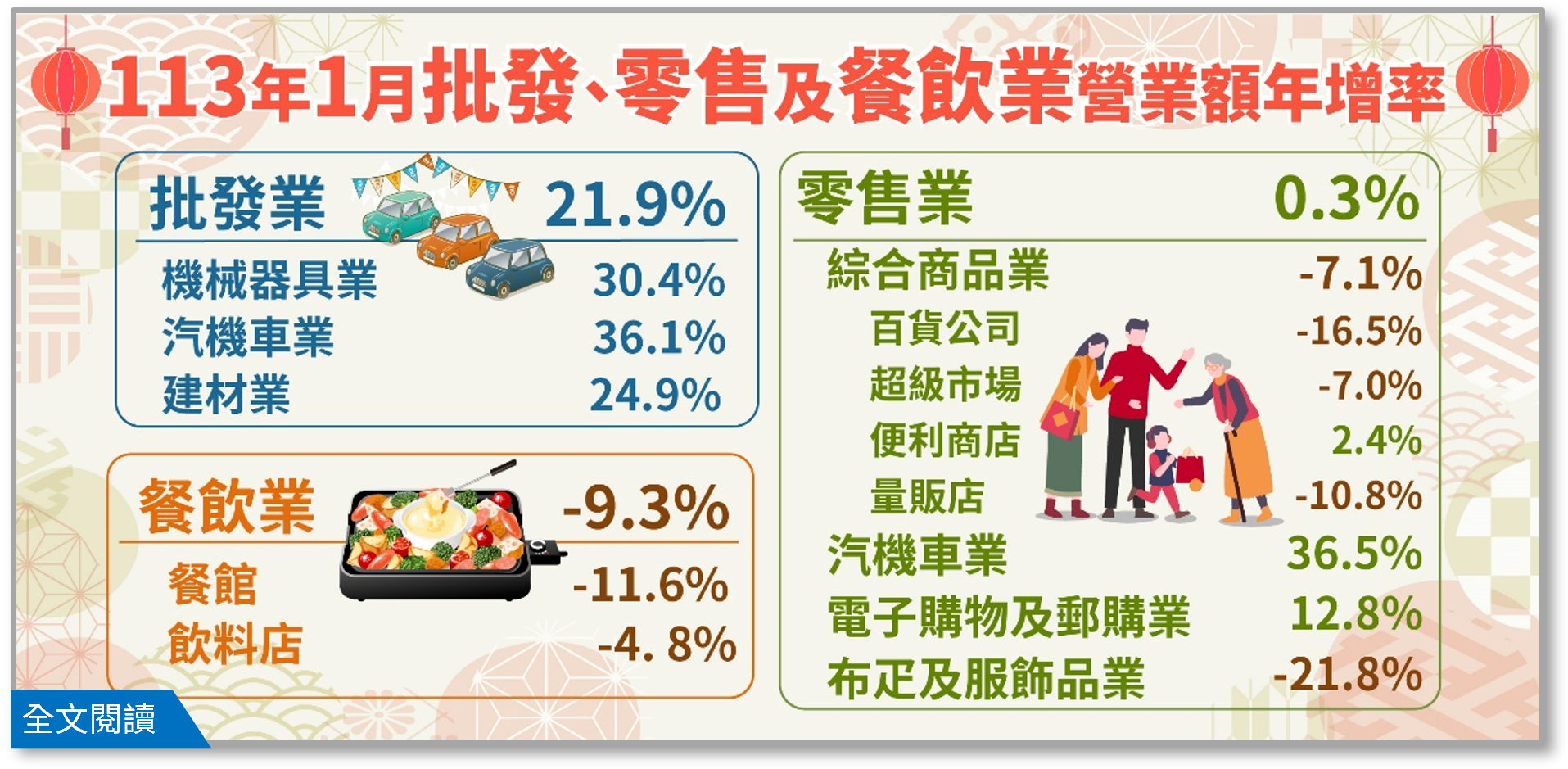 113年1月批發業營業額年增21.9%;零售業年增0.3%;餐飲業年減9.3%