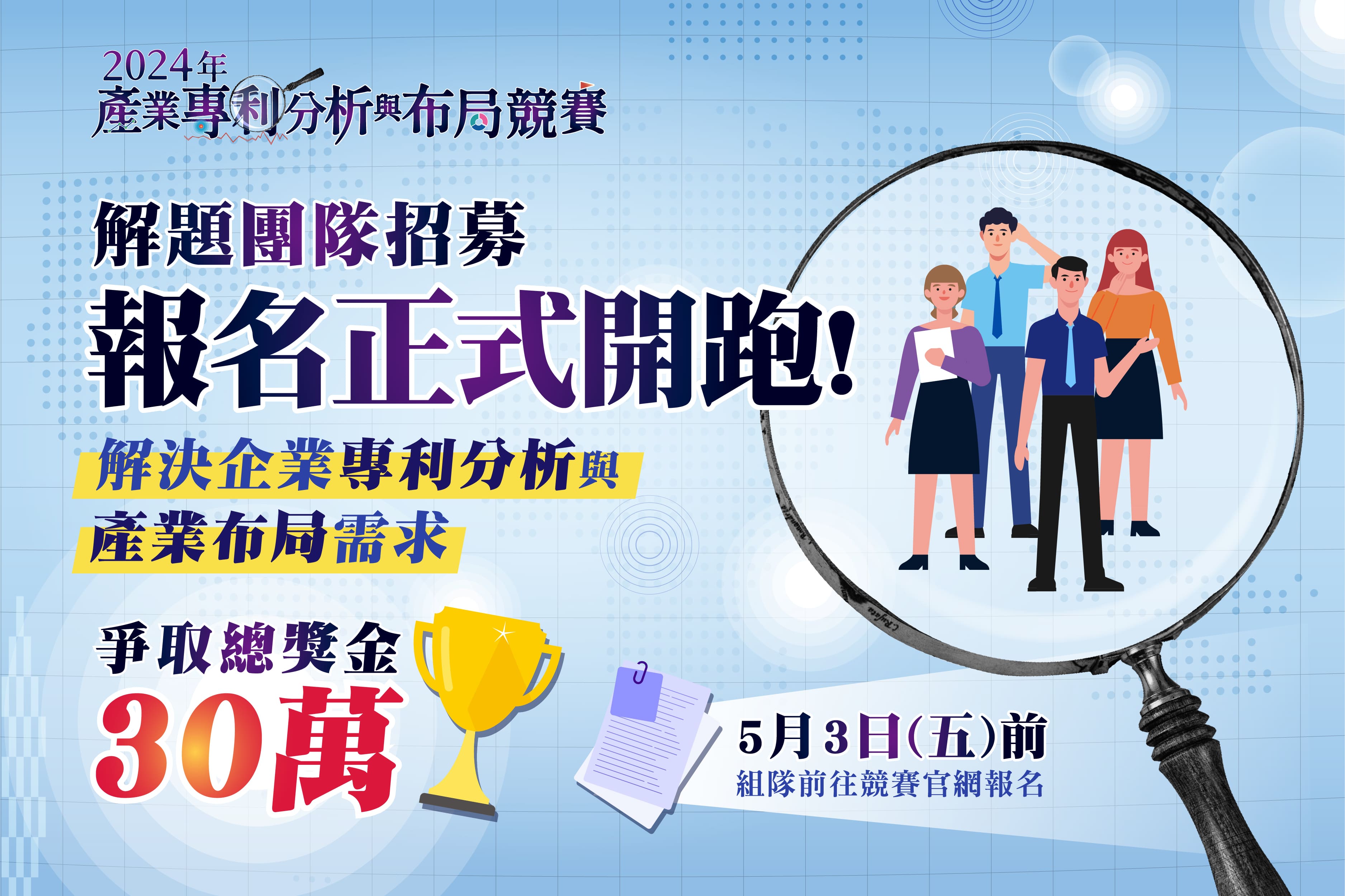 競賽活動自即日起開放報名至5月3日(五)止,智慧局敬邀國內專利分析人才及各路好手,組成參賽團隊報名參加競賽,一同角逐總獎金30萬元!欲進一步了解競賽活動詳情,歡迎參加3月22日競賽說明會,或至競賽活動網站參考競賽簡章。