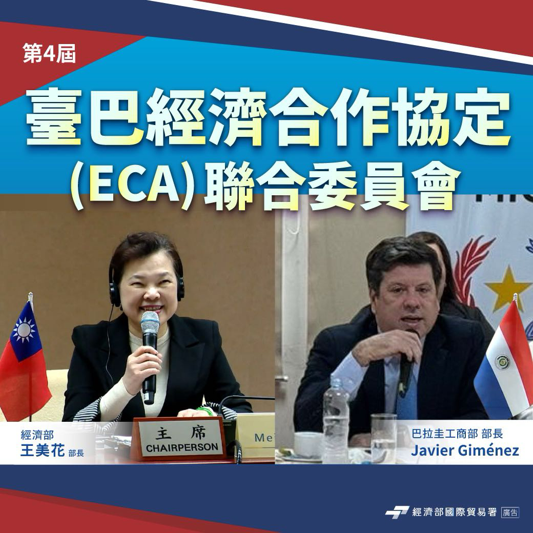 經濟部王美花部長與巴拉圭工商部長西梅內斯(Javier Giménez)於3月21日以視訊方式共同主持「第4屆臺巴經濟合作協定(ECA)聯合委員會」,雙方就市場進入等相關議題進行研商,以進一步開拓商機,深化雙邊經貿關係。