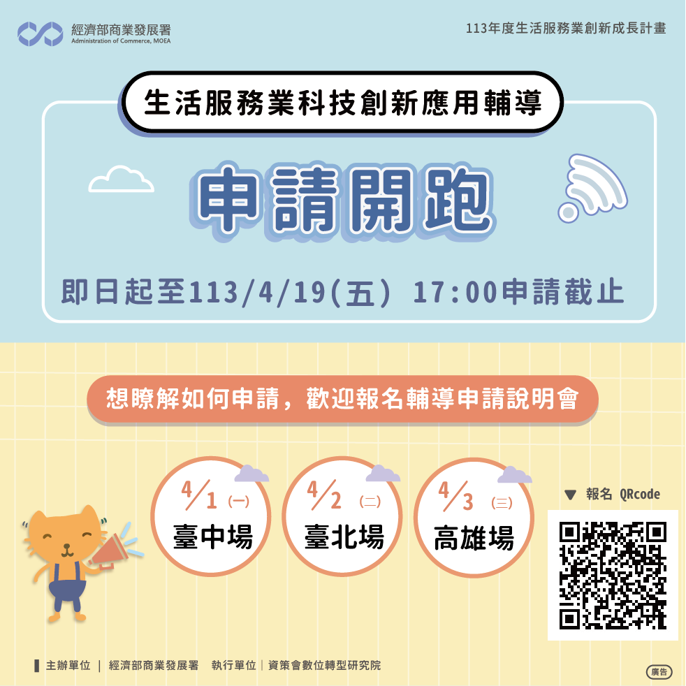 經濟部商業發展署辦理113年度「生活服務業科技創新應用輔導」,即日起受理提案申請,受理期間自即日起至113年4月19日(星期五)下午5時止,歡迎符合資格之生活服務相關業者提案申請!