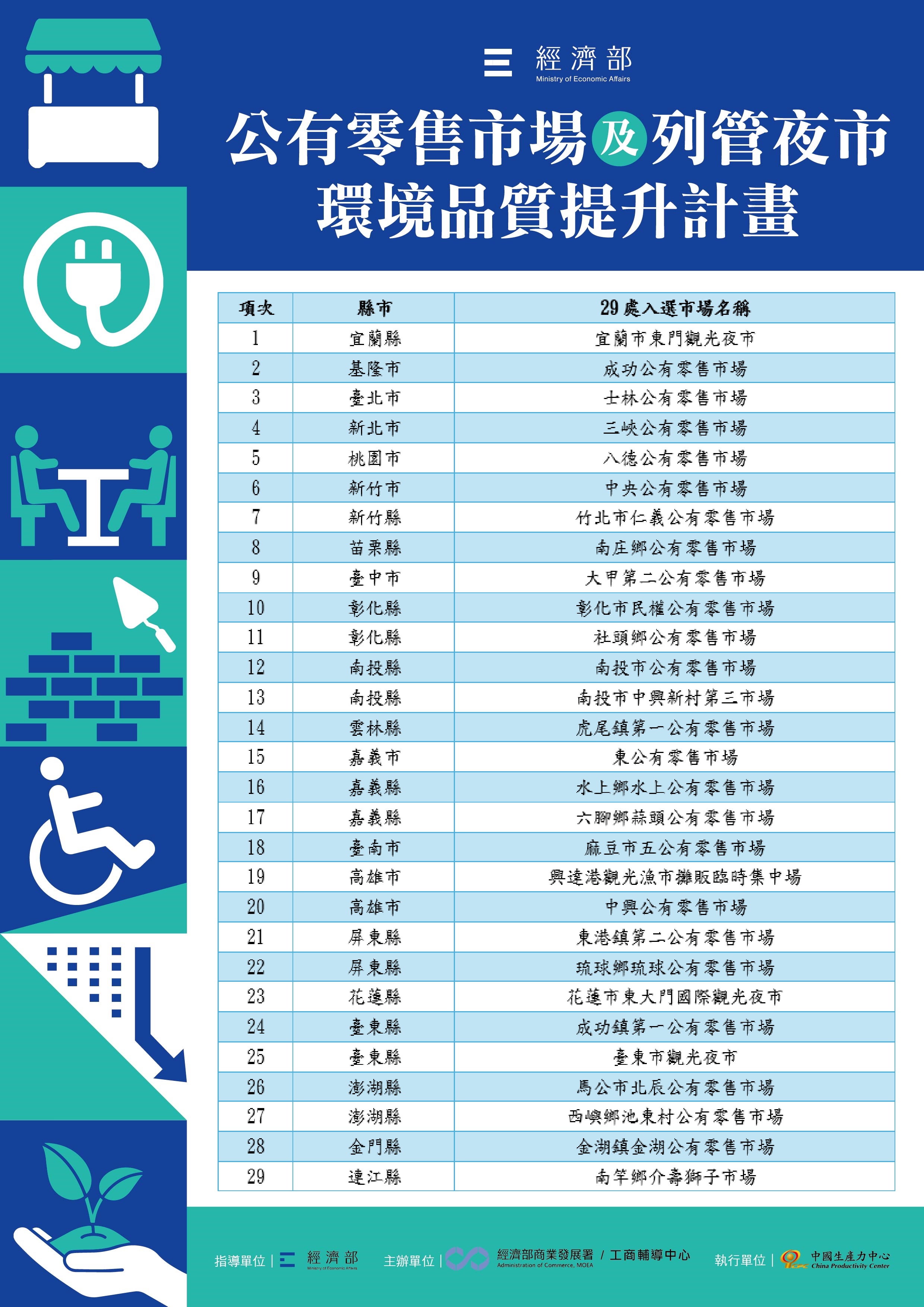 為滿足消費新型態需求,經濟部提報行政院核定「公有零售市場及列管夜市環境品質提升計畫」,每處市集補助經費上限 1500 萬元,獲得攤商的支持,促請地方政府就現有營運市場或夜市設施設備之整修改善等提出82處申請案,核定29處市場與夜市改善計畫,補助3億元經費。
