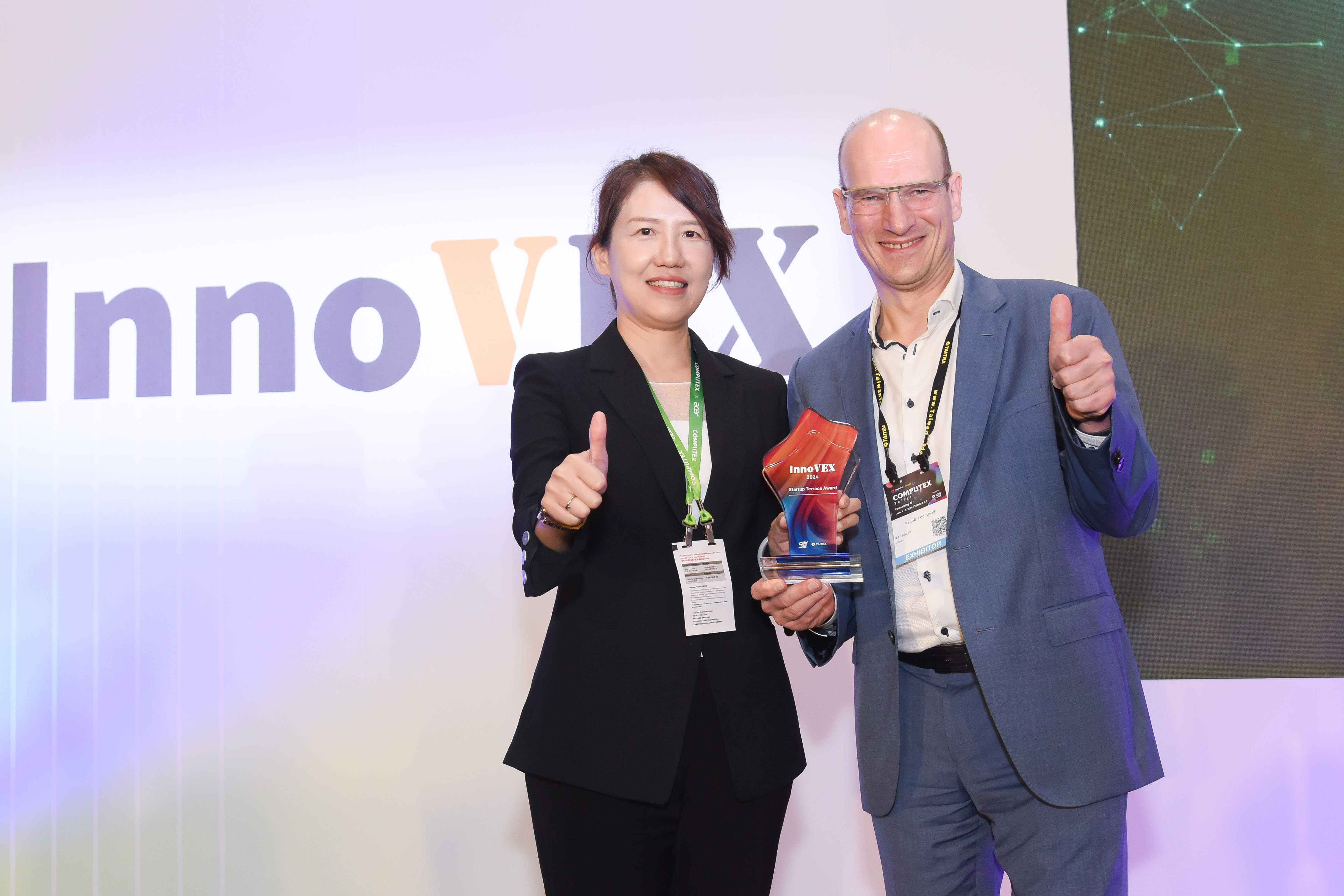 經濟部中小及新創企業署引領31家國內外優秀團隊,在亞洲最大的創新科技展InnoVEX 2024中,以「Startup Innovation」主題館展現臺灣的創新能力和成果。中企署並於「InnoVEX 2024創新創業競賽」增設Startup Terrace Award,6月6日由吳佳穎副署長頒發該獎項予德國NanoWired GmbH新創團隊,其專利技術,能夠掌控奈米線的長度、方向及均勻特性,獲得臺灣半導體產業青睞,認為可以應用在晶圓上,有機會取代目前錫焊接,銀燒結等技術,後續將進駐Startup Terrace拓展臺灣業務。