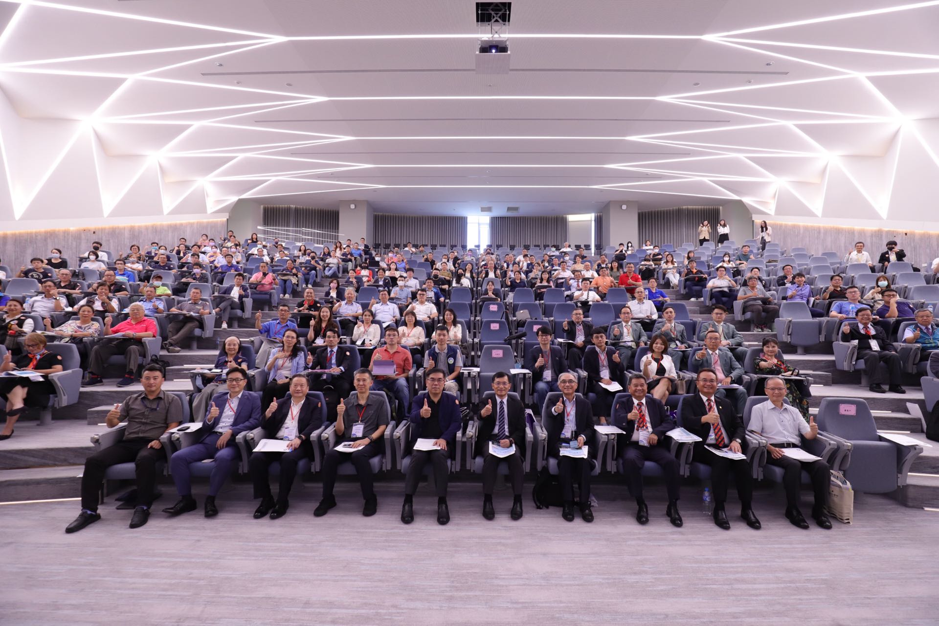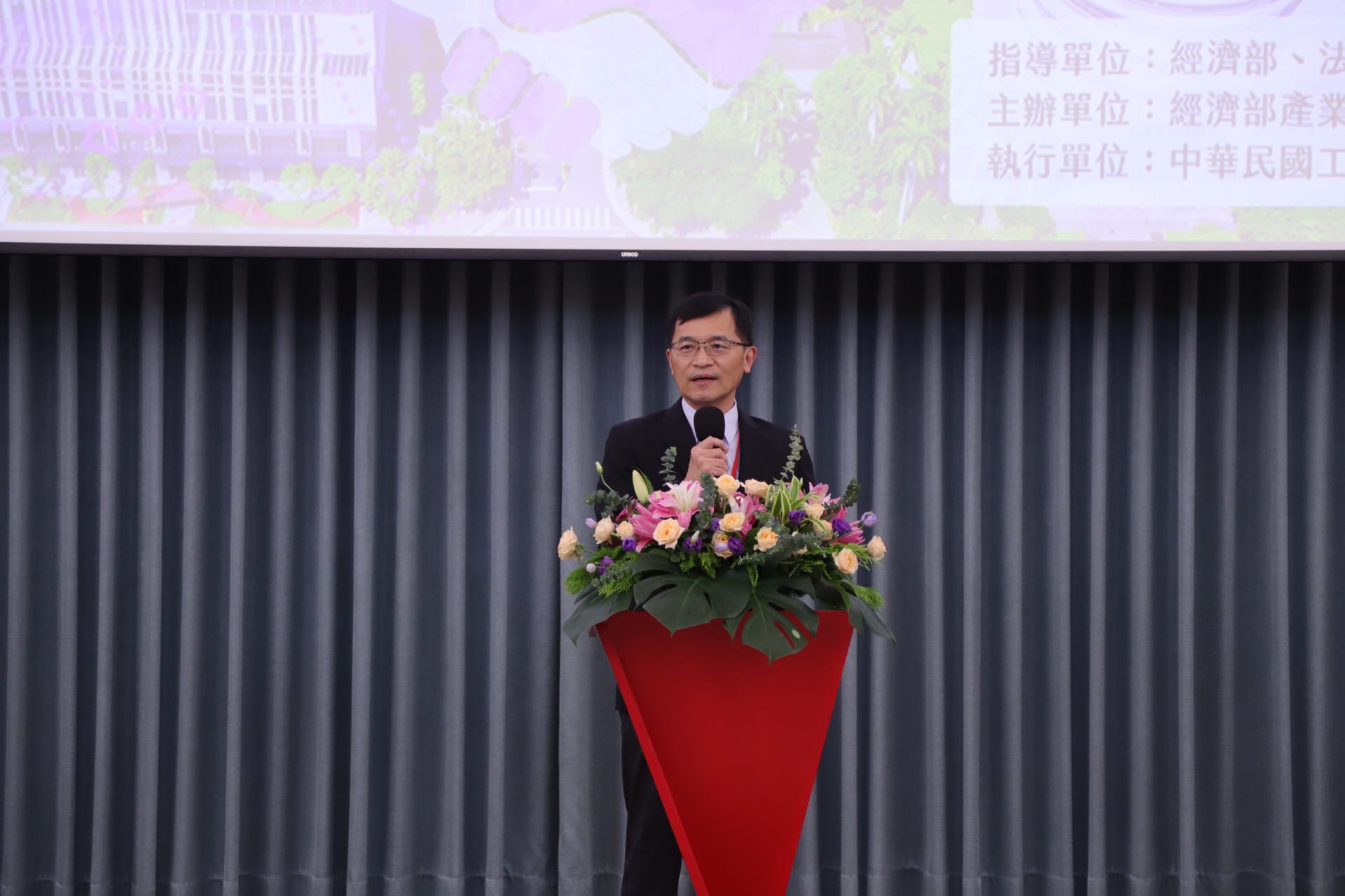 前排(左至右):中華民國工業區廠商聯合總會董正宗副理事長、總統府國策顧問暨中華民國工業區廠商聯合總會賴博司理事長、經濟部產業園區管理局楊伯耕局長、經濟部何晉滄次長、環境部彭啟明部長、經濟部產業園區管理局臺中分局紀世宗分局長、經濟部政風處廖常新處長、鼎新電腦劉祐男總經理