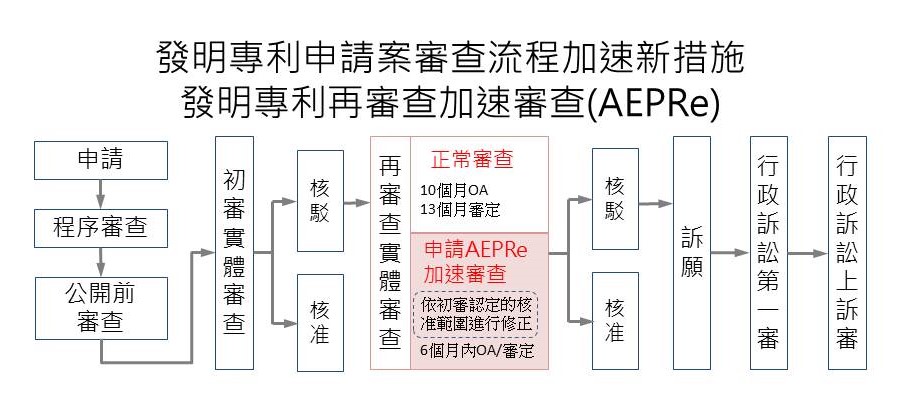 智慧局指出,發明專利審查有初審及再審查二個階段,若初審沒有核准,申請人可以提再審查,AEPRe加速審查是針對初審核駁審定理由僅核駁部分請求項的案件,若申請人於再審查時以「刪除核駁請求項、將未核駁請求項改寫為獨立項」的方式進行修正,使專利範圍成為初審認定的核准範圍,該再審查案件即可以提出AEPRe申請,智慧局將進行加速審查,6個月內就會發出審查意見。