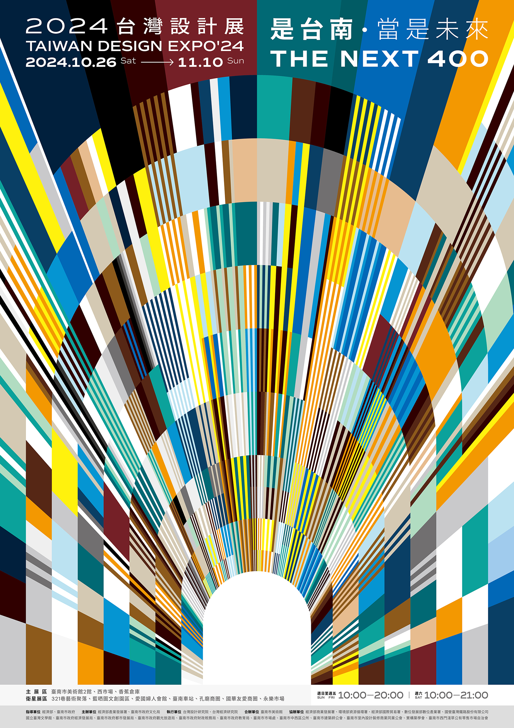 展覽靜態主視覺由在地團隊「Path & Landforms」袁文生及團隊設計,以臺南圓拱形城門、廊道的經典意象創造「穿越」的概念,城門彷彿是穿越時光廊道的入口,將過去與未來緊密連接,行走在其中如同踏上時空之旅。此外,團隊巧妙運用視覺色彩計畫,帶出了臺南的雙重魅力,暖色系代表地貌古蹟、民情信仰;冷色系代表經貿水路、綠能科技。畫面裡相鄰的無數繽紛色塊,是帶有歷史記憶的磚牆,也代表臺南在地閃耀的百工百業,透過色彩與結構的重組,層層堆疊的磚轉化為穿越時空的光束,帶領我們穿越歷史的長河,見證城市的發展。