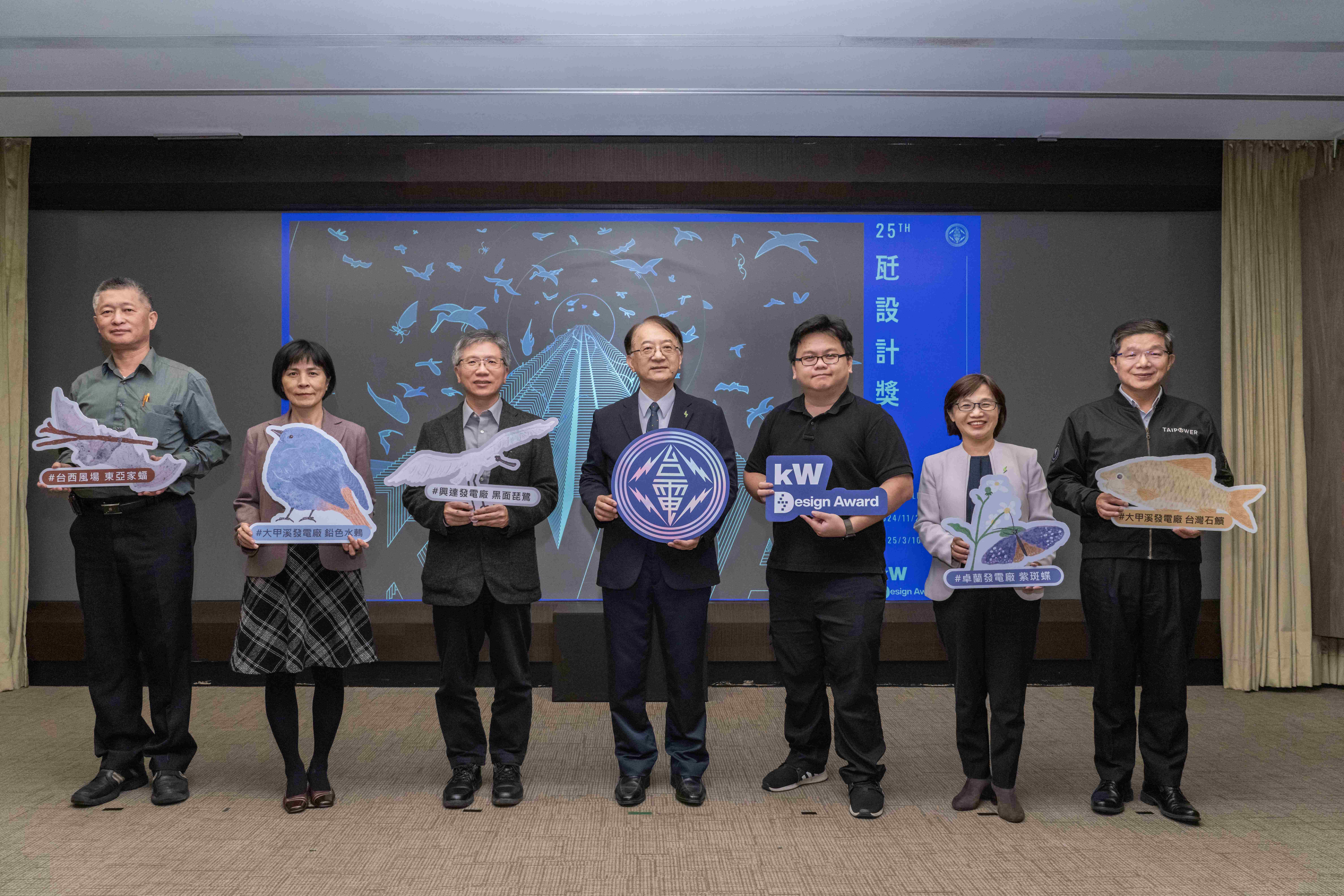 台電28日下午於台電大樓舉辦「瓩設計獎 kW Design Award-第25屆創意競賽」起跑活動,由台電副總經理蔡志孟、二棲設計創辦人林呈軒、IF OFFICE創辦人馮宇、海流設計創辦人陳泳勝、品墨良行創辦人王慶富、格式設計展策創辦人王耀邦、臺北科技大學互動設計系陳圳卿系主任等設計界及學界貴賓共同為本屆競賽揭開序幕,現場也首度曝光第23屆得獎作品「台電萬年曆」實際量產成品,運用發電煤灰循環材料再製而成,讓創意成真。