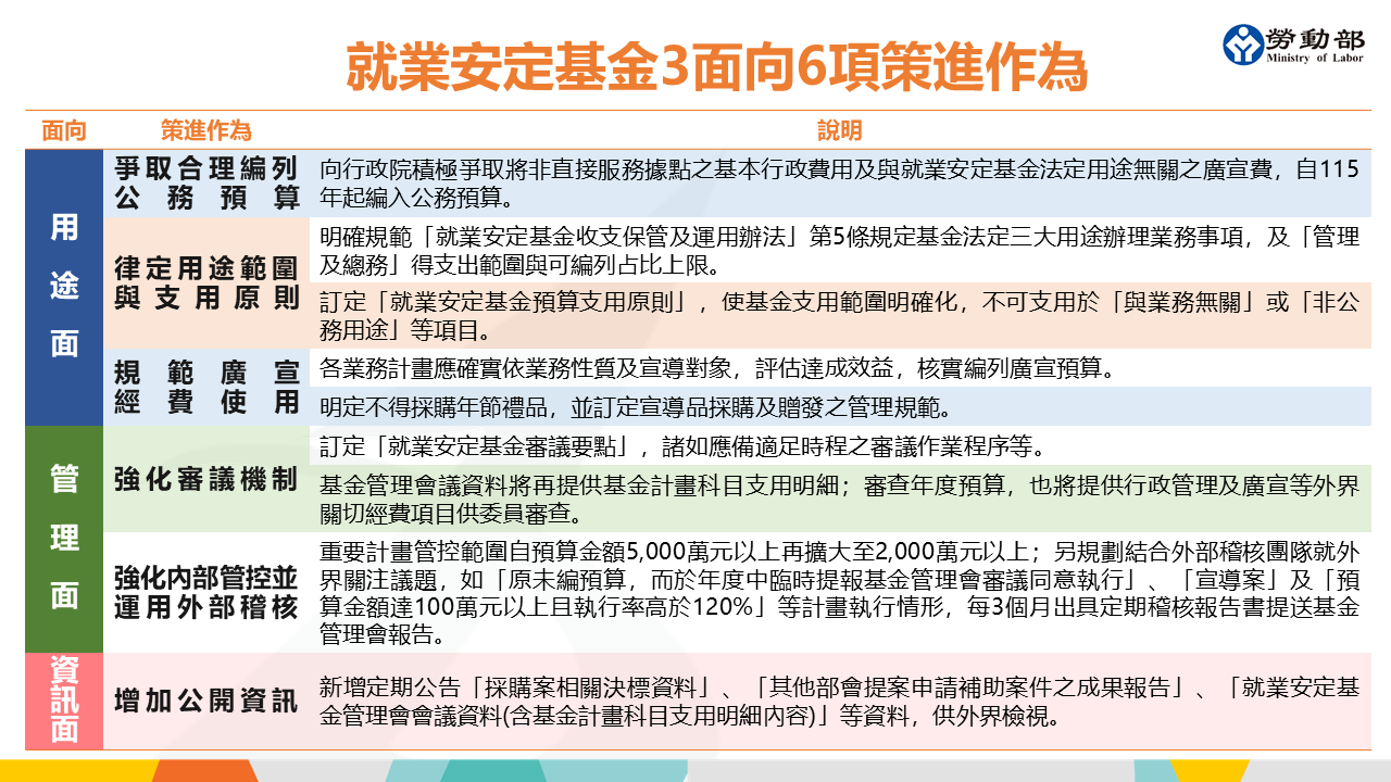 勞動部說明,對就業安定基金管理運用之精進,經檢討在基金用途、管理及資訊等面向尚有再精進之處,從而規劃從用途面、管理面及資訊公開等3面向,提出6項策進作為: