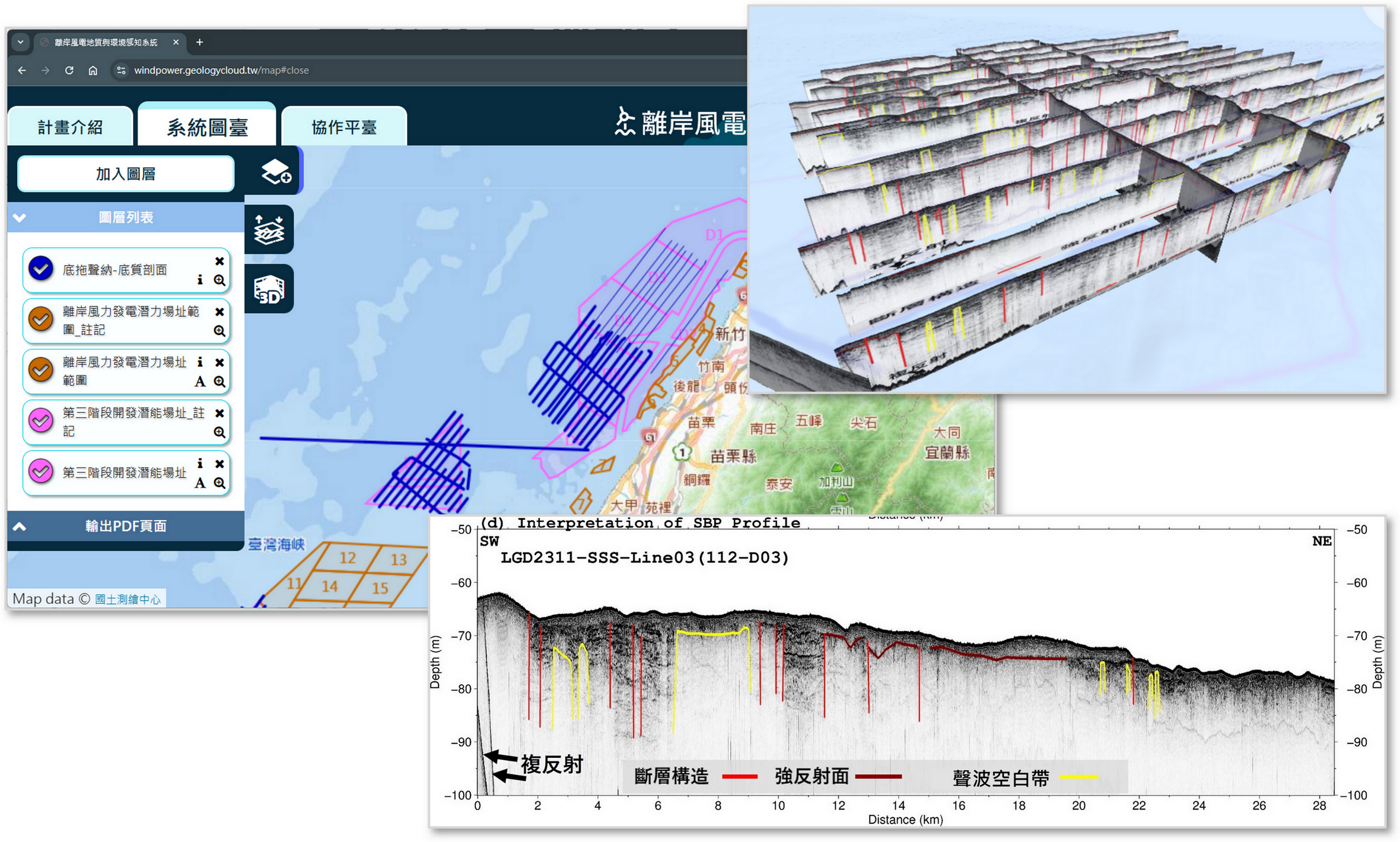 為能整合地質資料與環境限制條件,支援政府決策與產業場址規劃,地礦中心打造「離岸風場地質與環境感知系統」(https://windpower.geologycloud.tw/map),可直接下載調查成果高解析圖檔,亦提供斷層、流體特徵、沙波、堅硬地層、背斜等地質安全影響因子的分布及影響潛勢。在功能方面,提升了風險圖資精度與可視化功能,強化決策依據。系統另新增3D檢視、風力發電潛力計算等新功能,提升規劃靈活性。地質資訊將有助於離岸風場的選址和規劃決策,確保風機在複雜的海洋環境中穩定安全運行,促進離岸風電產業的蓬勃發展。
