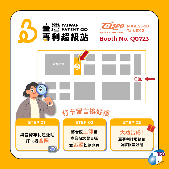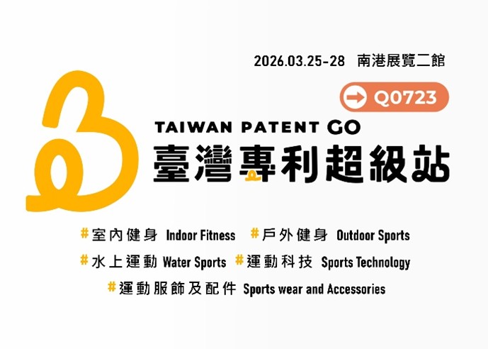 為推動臺灣專利鏈結國際市場,智慧局於今(24)日發布臺灣專利超級站首站將於3月25日至3月28日,在南港展覽館二館舉辦的「台灣國際運動及健身展」盛大登場,藉由國際級專業展覽平台,展現臺灣在運動科技與健康產業領域的創新實力與專利成果。