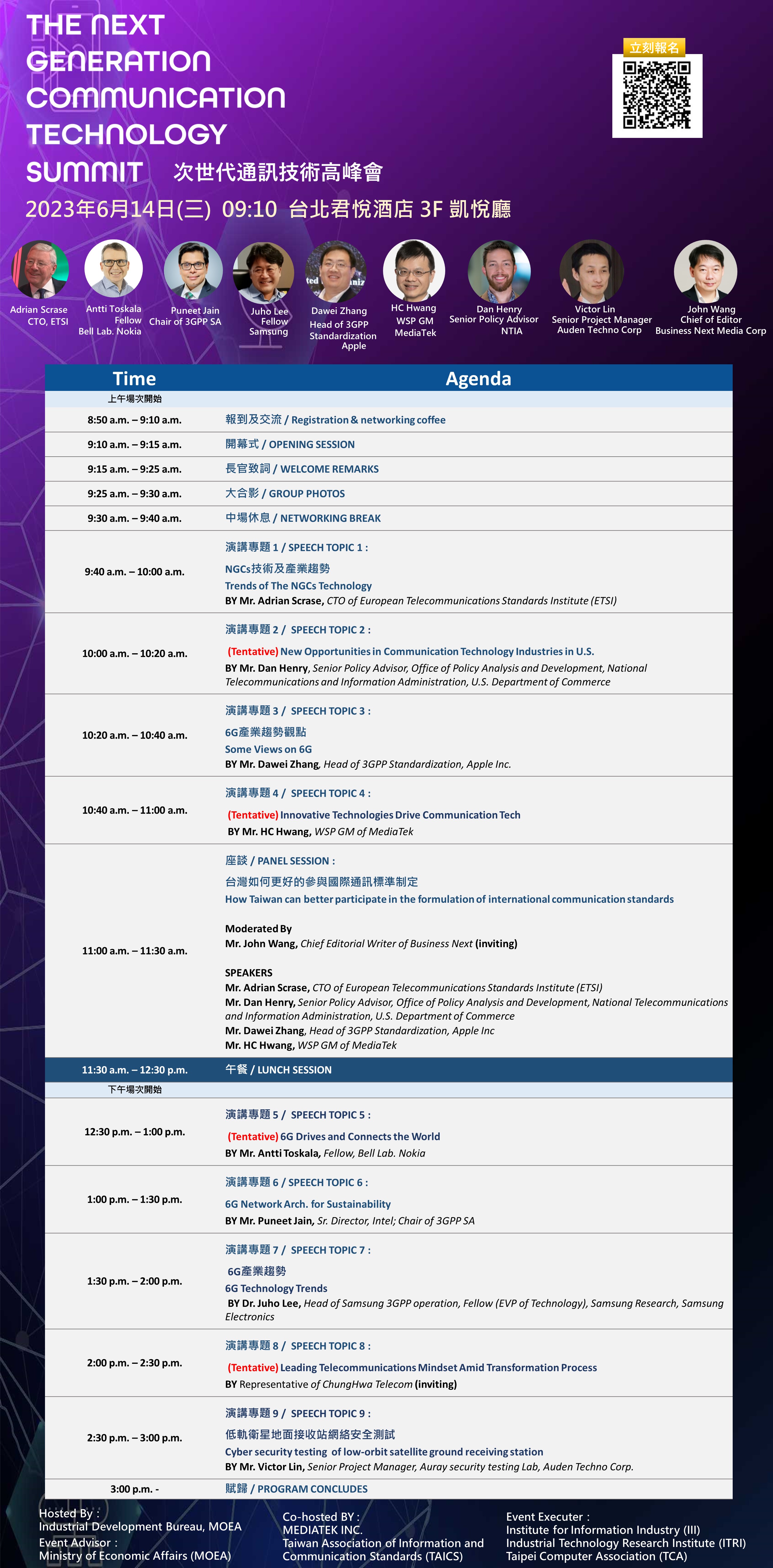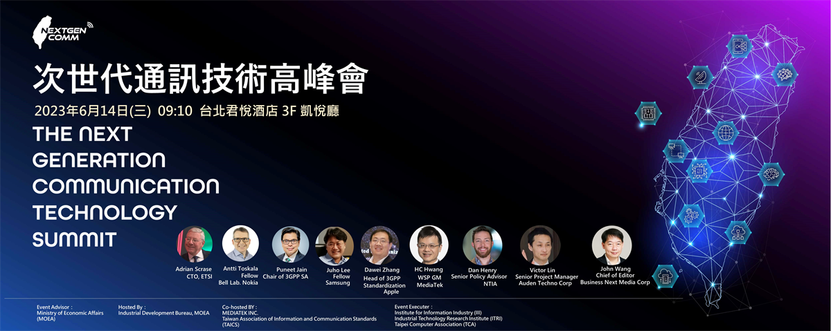 為有效鏈結國內資通訊業接軌全球6G標準,掌握國際合作契機與創造新局,將於6月14日假台北君悅酒店舉行「次世代通訊技術高峰會」,邀請歐洲電信標準協會(ETSI)、國內外大廠如Apple、Samsung、Nokia、Intel、聯發科等,針對「全球6G通訊標準與未來趨勢」、「6G通訊創新突破」、「6G基礎建設部署」、「資通訊節能策略」等焦點議題,帶來國際最新的觀點與趨勢分享。