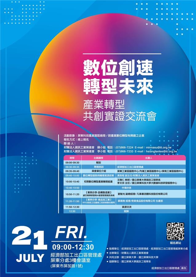 經濟部加工出口區管理處屏東分處與財團法人資訊工業策進會、國立屏東大學及屏東科技大學共同辦理「數位創速 轉型未來-產業轉型共創實證交流會」,本活動完全免費,歡迎貴公司踴躍報名參加。