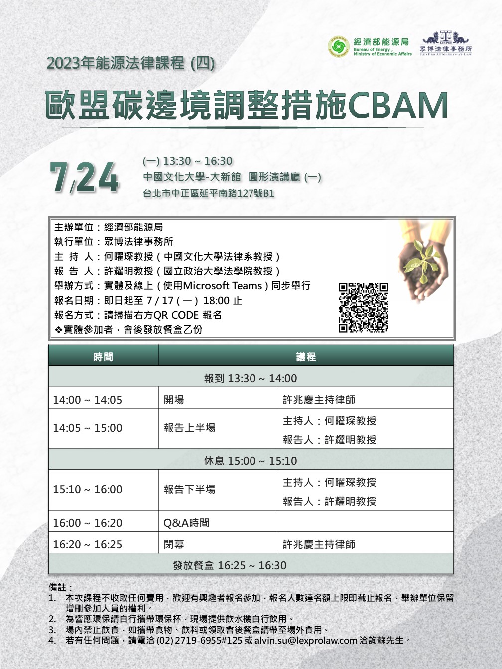 能源法律系列課程(四)「歐盟碳邊境調整措施CBAM」將於2023年7月24日實體及線上同步舉行 (2023-07-24