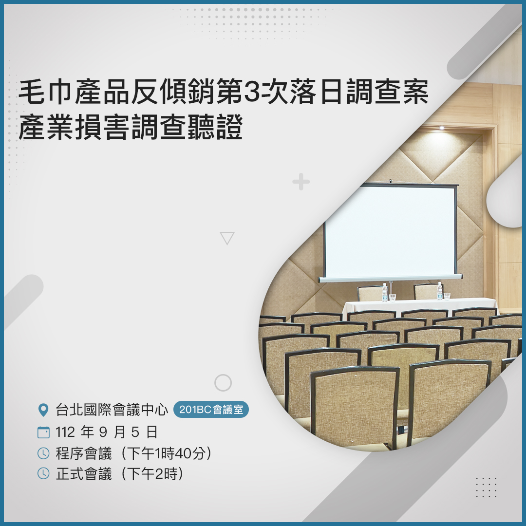 毛巾產品反傾銷第3次落日調查案產業損害調查聽證 (2023-09-05 13:40 ~ 2023-09-05 17:00)