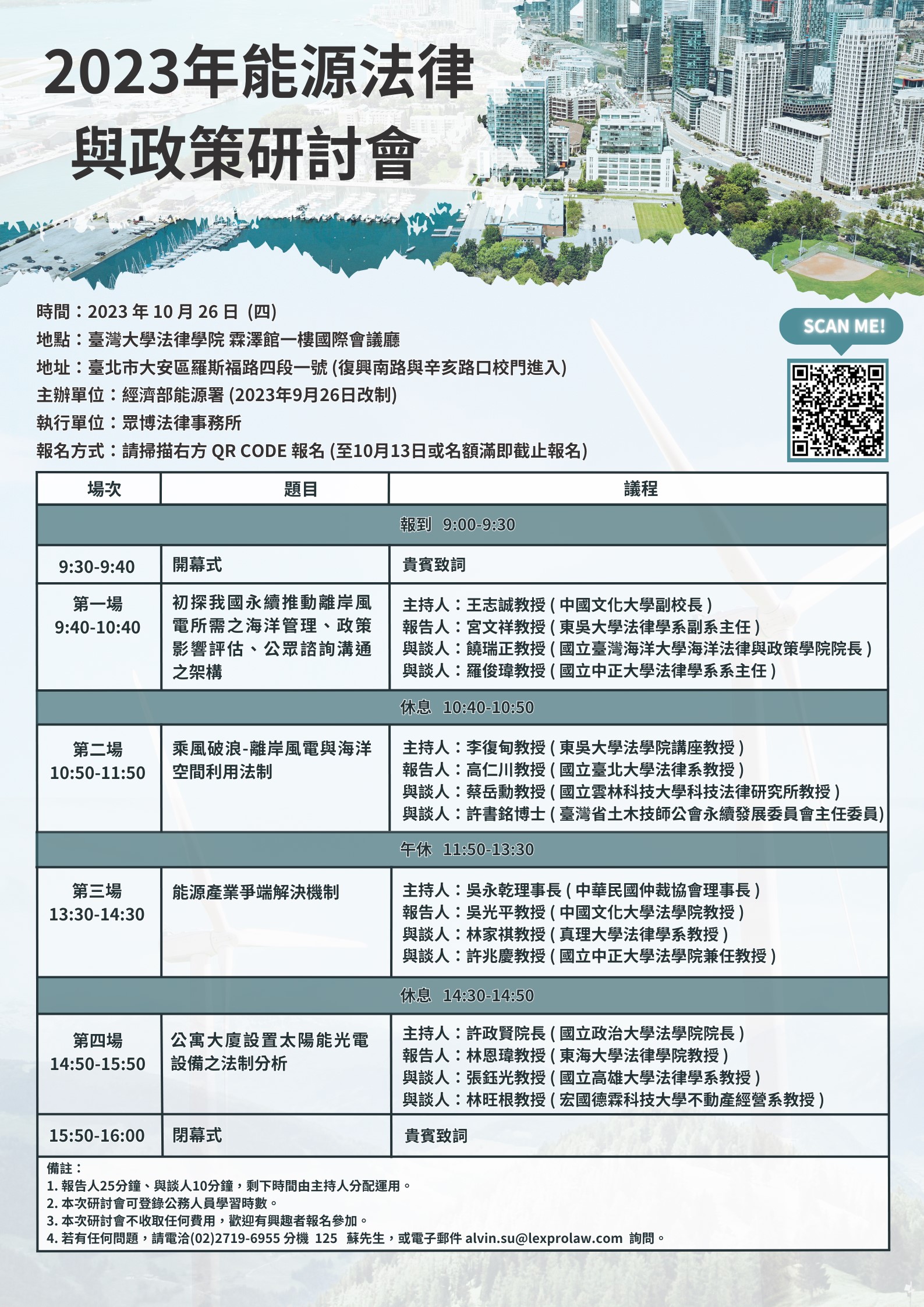 「2023年能源法律與政策研討會」將於2023年10月26日於臺灣大學法律學院霖澤館1樓國際會議廳舉行 (2023-10-26 09:00 ~ 2023-10-26 16:00)