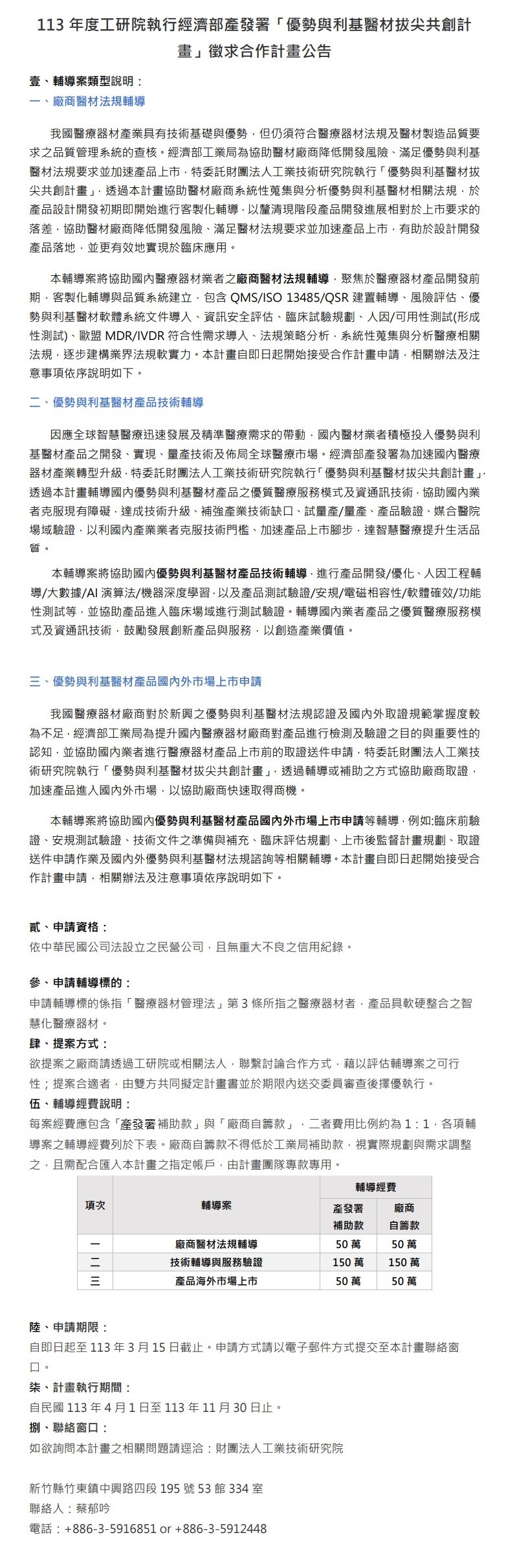 為促進國內醫療器材的創新與強化產業轉型,增加臺灣優勢與利基醫療器材產業競爭力,進而提升國產醫材國際能見度與外銷營業額,經濟部產發署委託財團法人工業技術研究院執行「優勢與利基醫材拔尖共創計畫」。