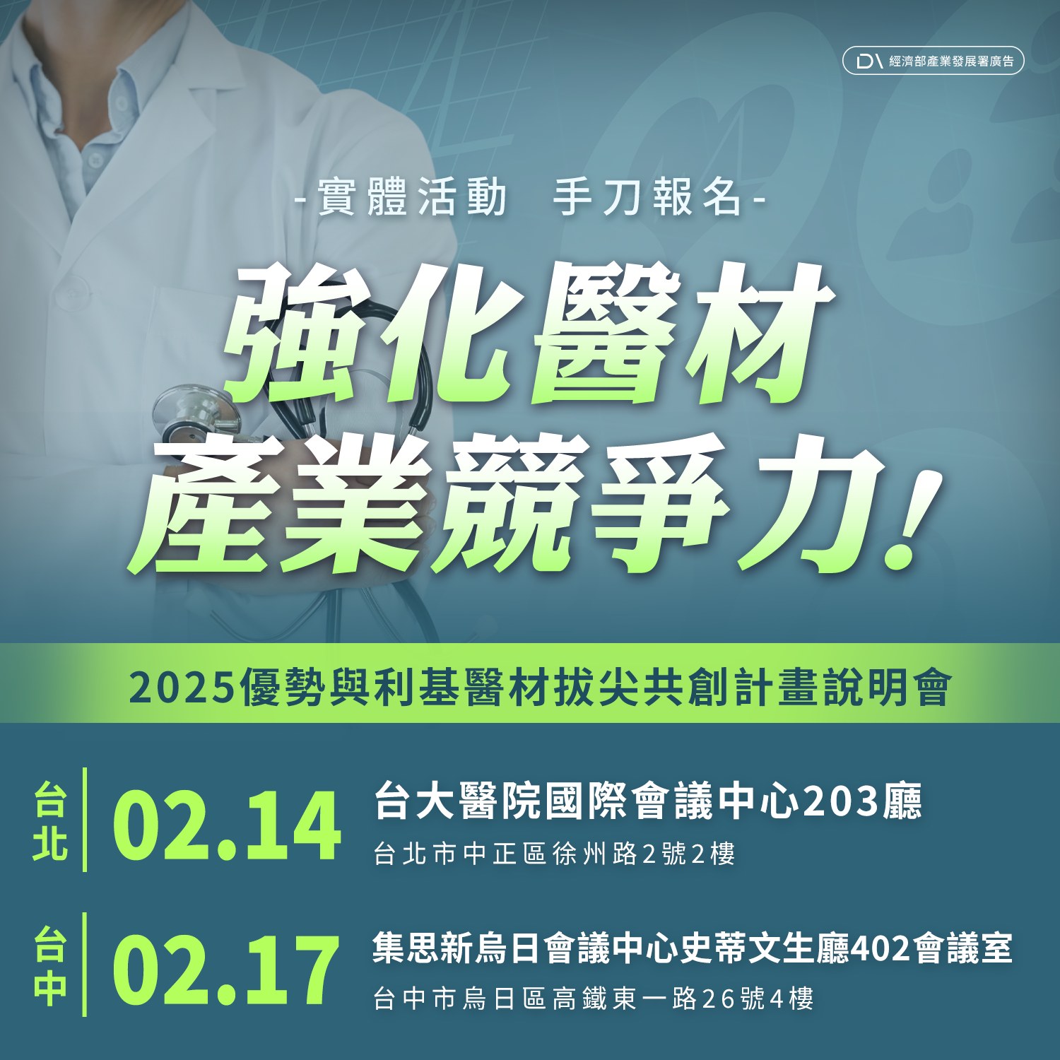 為促進台灣 #醫療器材 的創新及強化產業轉型,提升🇹🇼國產醫材國際能見度與外銷訂單📈,#經濟部產業發展署 委託 #工研院 生醫與醫材研究所執行的「💎#優勢與利基醫材拔尖共創計畫」,近期即將辦理說明會囉🙌