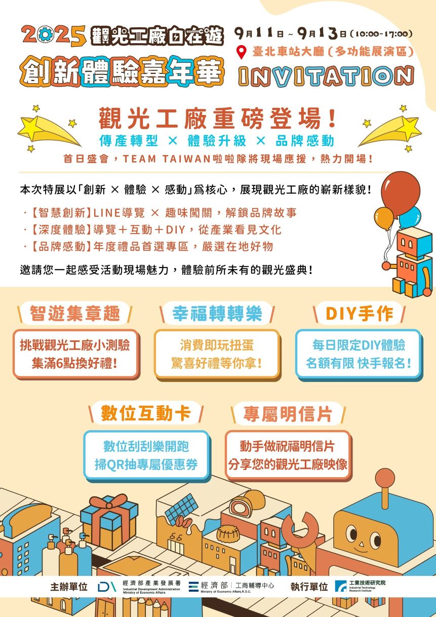 經濟部產業發展署與工商輔導中心持續深耕產業轉型,提升觀光工廠的國際吸引力,推動產業與觀光結合創造新價值,向國際旅客展示臺灣產業文化的深度與多元創新能量。為整合行銷與推廣,深化「產業即觀光」的輔導成果,於2025年9月11日至9月13日在臺北車站一樓大廳舉辦「2025觀光工廠創新體驗嘉年華」,由經濟部何晉滄次長為活動揭開序幕,現場規劃六大特色亮點展區,以「創新 x 體驗 x 感動」為核心理念,匯集產業文化、跨域整合與沉浸體驗,邀請民眾共襄盛舉。