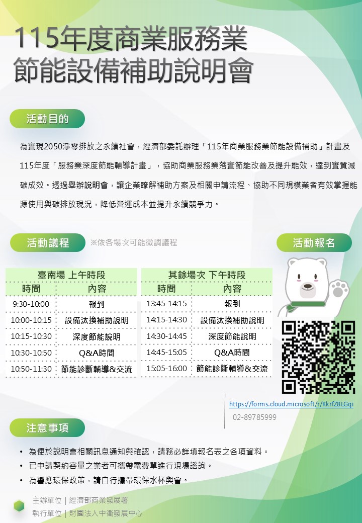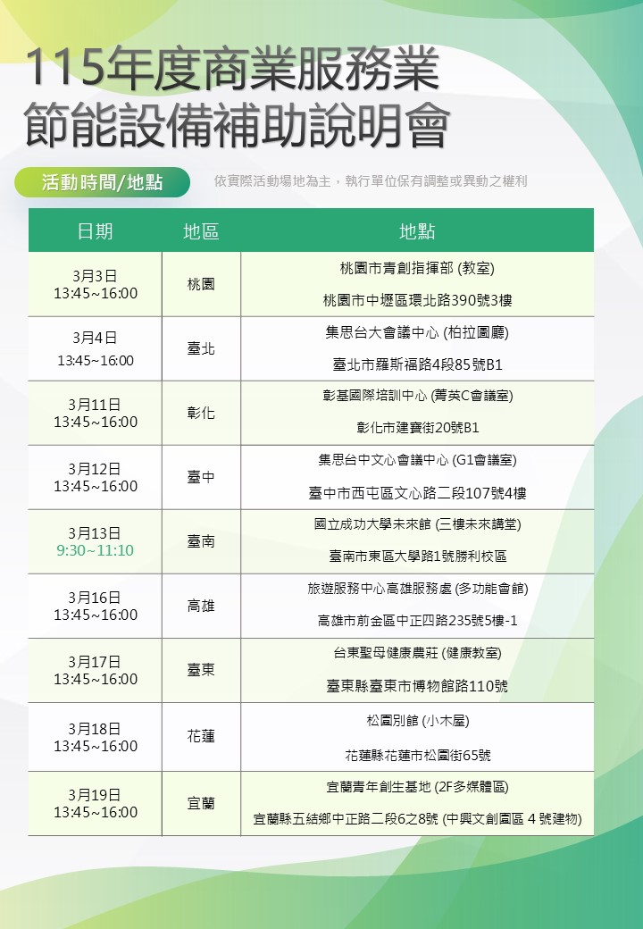 115年商業服務業節能設備補助暨節能技術輔導說明會 (2026-03-03 13:45 ~ 2026-03-19 16:00)