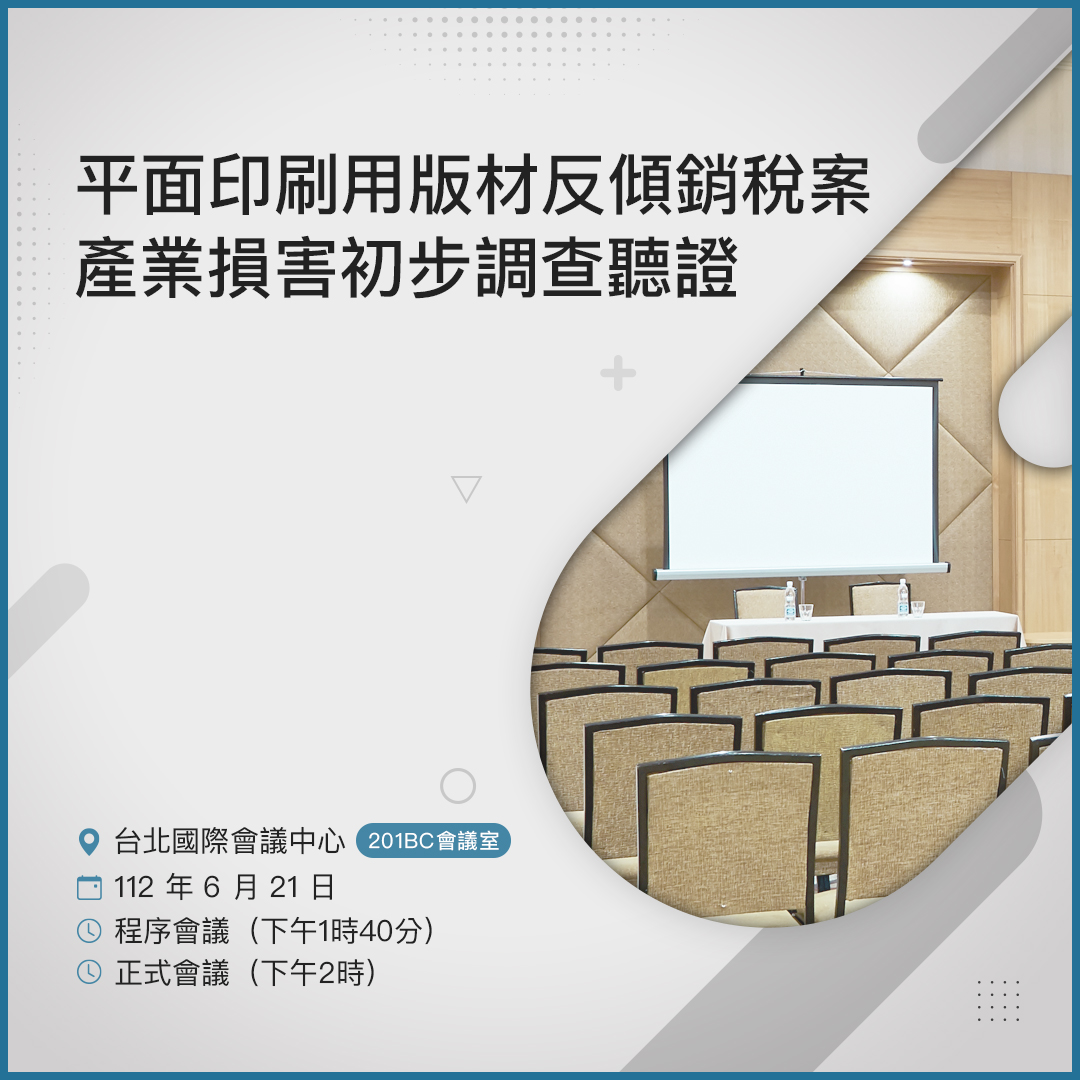 主旨:公告就「太普高精密影像股份有限公司申請對自中國大陸產製進口平面印刷用版材課徵反傾銷稅及臨時課徵反傾銷稅案」進行產業損害初步調查及舉行聽證。