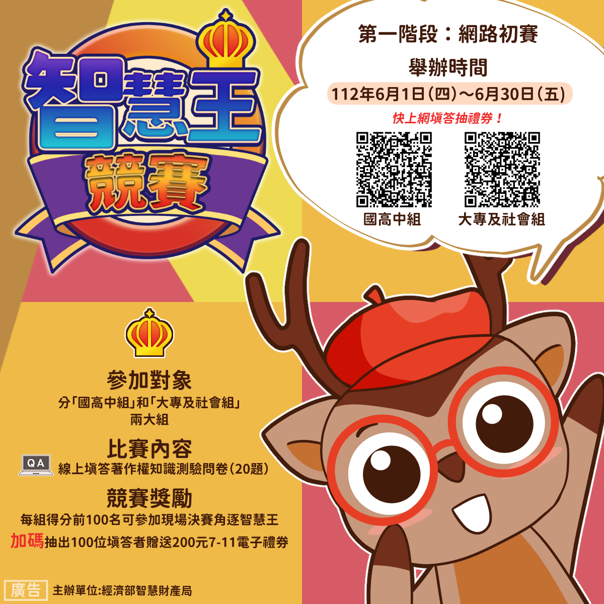 「智慧王競賽」分為網路初賽與實體決賽兩階段,參與對象區分為「國高中組」與「大專校院及社會組」,競賽過程會將常見著作權疑義融入益智問答題目,只要參加初賽挑戰答題,就有機會抽中200元超商禮券!另為吸引各界踴躍參賽,各組得分前100名將可獲邀參加實體決賽(預計7月30日舉行),共同角逐智慧王,決賽總獎項價值超過6萬元,千萬別錯過初賽熱身!
