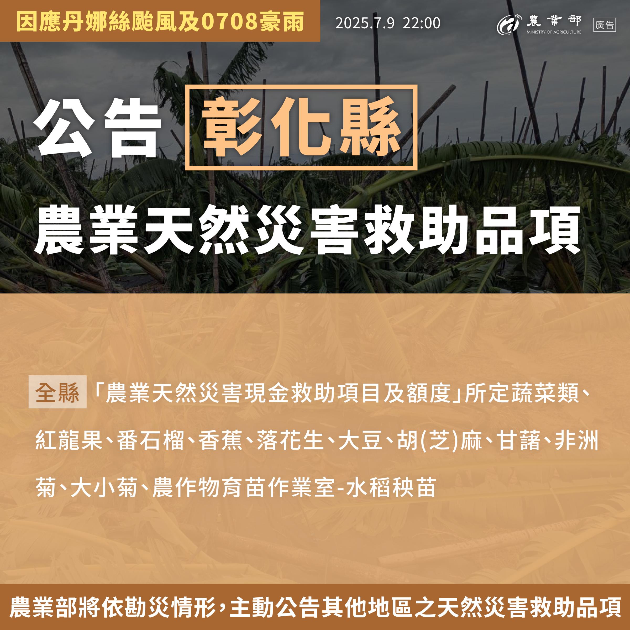 • 彰化縣:農產業-「農業天然災害現金救助項目及額度」所定蔬菜類、紅龍果、番石榴、香蕉、落花生、大豆、胡(芝)麻、甘藷、非洲菊、大小菊、農作物育苗作業室-水稻秧苗
