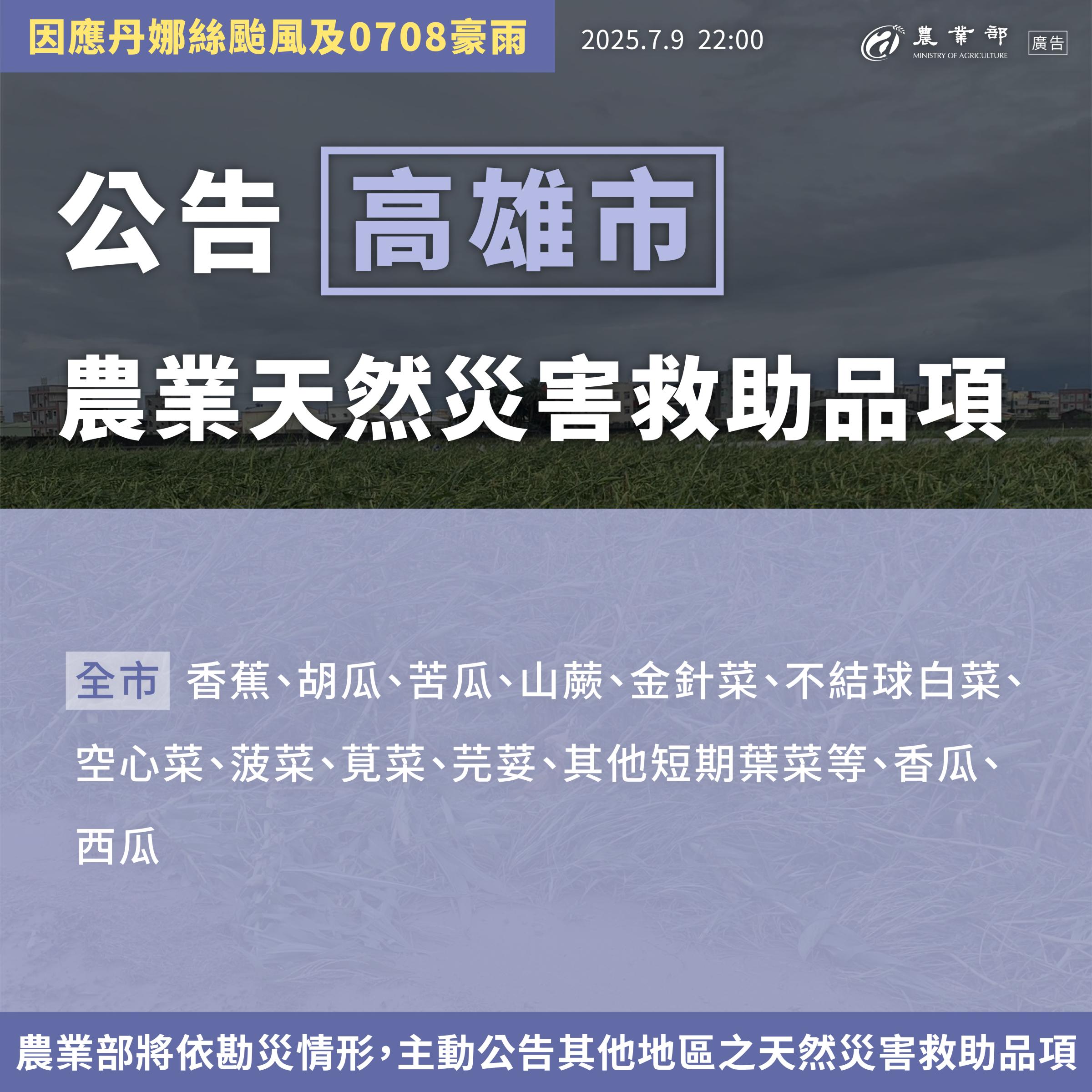 農業部部長陳駿季今(9)日再度召開專家會議,除繼續針對丹娜絲颱風造成的農損進行評估外,也就0708豪雨對彰化等地造成的損害一併討論。農業部表示,丹娜絲颱風及連日的強降雨造成中南部農損嚴重,農業部立即啟動天然災害救助機制,主動公告災損嚴重的產業、區域及作物品項,協助受災農漁民復耕復養,最新公告的縣市包含彰化縣、雲林縣、高雄市及屏東縣。