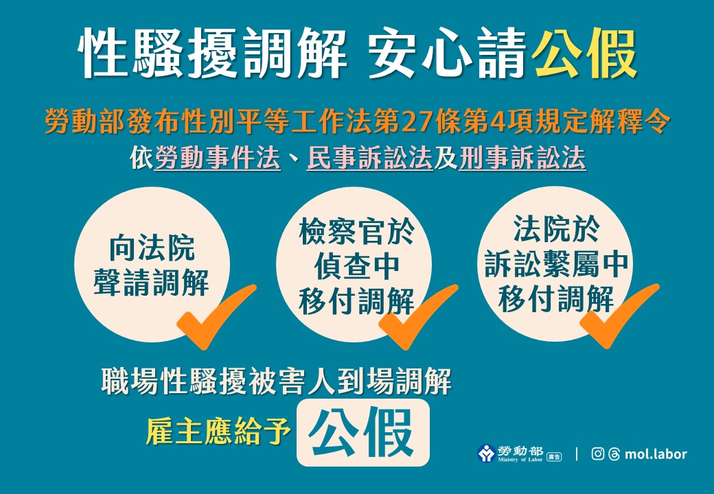 《性別平等工作法》第27條第4項規定,被害人因遭受性騷擾致生法律訴訟,於受司法機關通知到庭期間,雇主應給予公假;勞動部今(25)日發布解釋令,核釋所定「法律訴訟」,包含依勞動事件法、民事訴訟法及刑事訴訟法規範所進行、移付法院或鄉、鎮、市、區調解委員會之調解程序,於調解期日到場調解期間,雇主應給予公假,並自即日起生效。